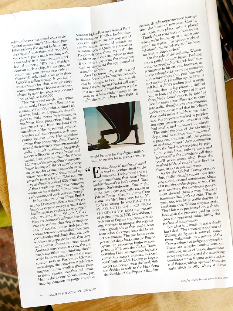 I’m so happy that Walking the Bypass: Notes on Place from the Side of the Road has been reviewed in the October 2025 issue Harper’s Magazine! The digital version is online now; physical copies will be on newsstands soon and in subscribers’ mailboxes even sooner. So many wonderful books don’t get this kind of attention; I’m grateful for the sustained, thorough engagement that the reviewer, Dan Piepenbring, brings to what I’ve written.
