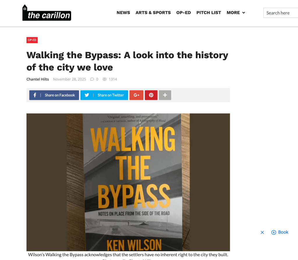 I just learned this afternoon that Walking the Bypass: Notes on Place from the Side of the Road has been reviewed in The Carillon, the University of Regina’s student newspaper, by Chantal Hilts.